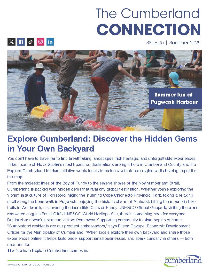 Check out what's happening around the Municipality of Cumberland over the next few months by going to https://www.cumberlandcounty.ns.ca/doclink/issue-05-summer-2025-final/eyJ0eXAiOiJKV1QiLCJhbGciOiJIUzI1NiJ9.eyJzdWIiOiJpc3N1ZS0wNS1zdW1tZXItMjAyNS1maW5hbCIsImlhdCI6MTc1MDE0NTUzMSwiZXhwIjoxNzUwMjMxOTMxfQ.gUWsGBsUZq2HEqvrzWA6Kfm34Vx4JKf60uPRIZXtBT0